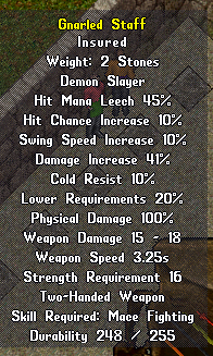 3rd - I wanted to imbue the 62% Hit Mana Leech but, I am not sure why, the imbuing gump, when increasing the percentage in small increments would not let me reach 62% but only 61% so, since this odd thing happened before to me when imbuing, I went with imbuing here 30% Swing Speed Increase as before the Hit Mana Leech (110 weight)