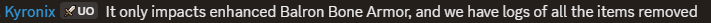 • Players who had Balron Bone Armor stored in a house or on a vendor will find a container with the requisite number of items removed from that location beginning on October 17th, 2025 at 12:00pm ET