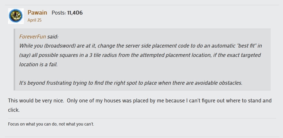 The biggest issue is that we are having to wait about 2 minutes between placement attempts if the house doesn't fit. other than that, i have no issue with how it works. I know on NL if I missed the first atempt, it would take me 20 minutes or longer to place a house and I lost a couple of spots that i wanted, that I could have placed in if i wasn't waiting between attempts.